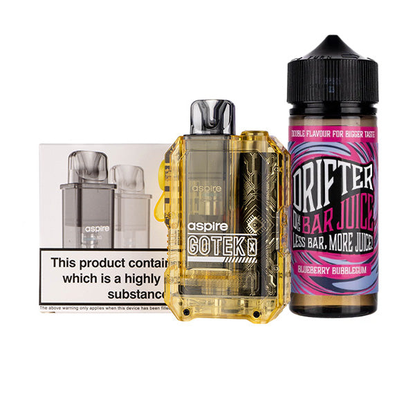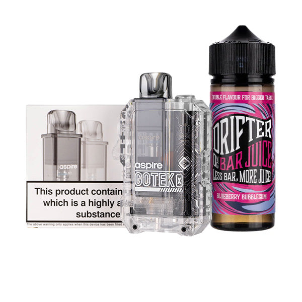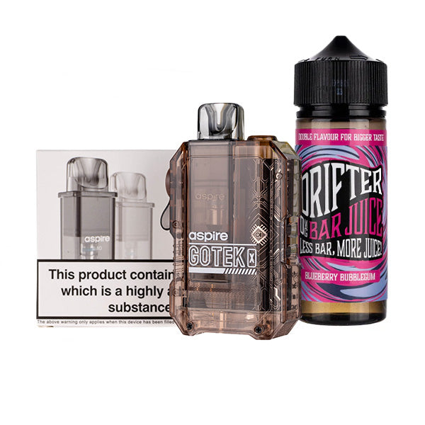 Bundle Special: 1 x Aspire GoTek X Pod Kit, 1 x pack of replacement pods & 1 x 100ml Drifter (50/50) Shortfill – Worth £48.80! The GoTek X Pod Kit Bundle saves you over 25%!