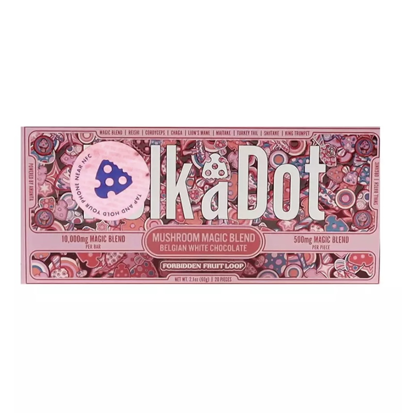Enchanting Flavor Harmony: Forbidden Fruit Loop PolkaDot Magic Mushroom Belgian White Chocolate offers an enchanting harmony of flavors, where the velvety white chocolate meets the alluring essence of forbidden fruits, creating a taste symphony that captivates the palate.