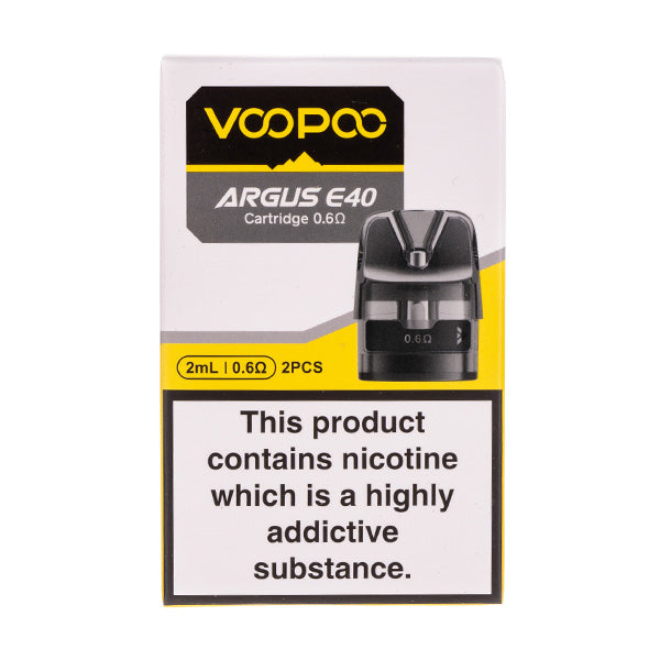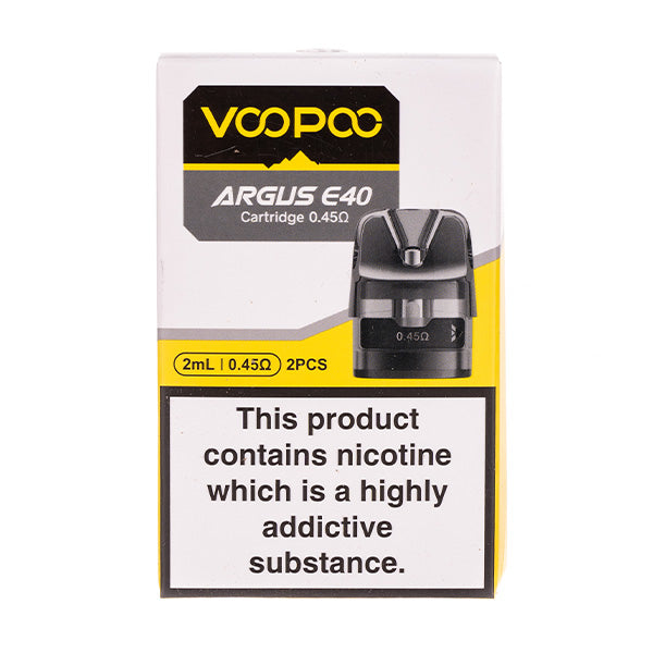 This is a two pack of replacement pods for the VooPoo Argus E40 Pod Kit. Each pod holds 2ml of e-liquid and is available in 0.3ohm, 0.45ohm or 0.6ohm. These pods are side-refilling, making them incredibly easy to fill when on the go.